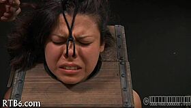 Caged Brunette Slave Gags on Cock During Hardcore Blowjob