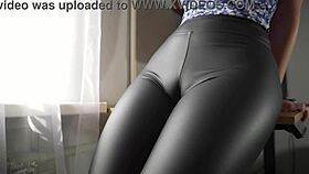 Office milf teases fat cameltoe through tight leather pants