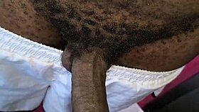 Hairy neighbor guy strokes his big black cock indoors casually