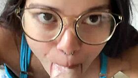 nerdy brunette with big natural tits gives deep blowjob to wellington prado in jeans shorts