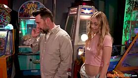 petite shaved teen gags on cock then fucks outdoors at arcade