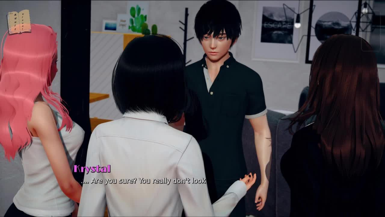 In this anime hentai game, a group of characters engage in a blowbang scenario with cum and banging