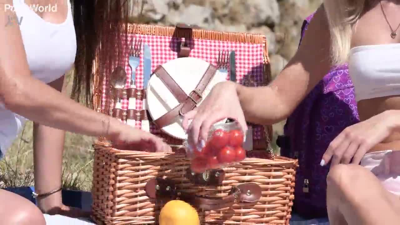 Picnic perfection: lesbian babes candee licious and olivia del rio share a strap-on in the countryside, licking and riding each other. 😍