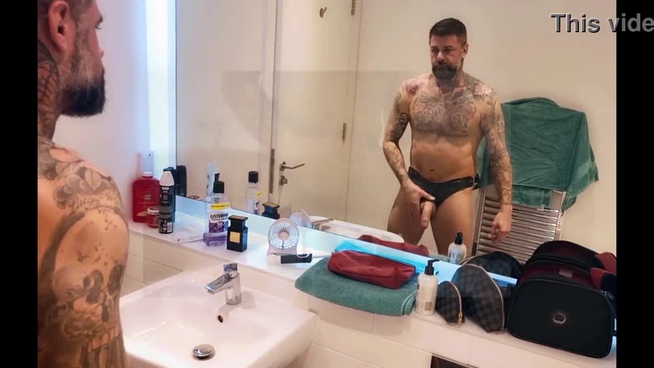 Sexy guy with huge hairy cock jerks off in the bathroom 😏